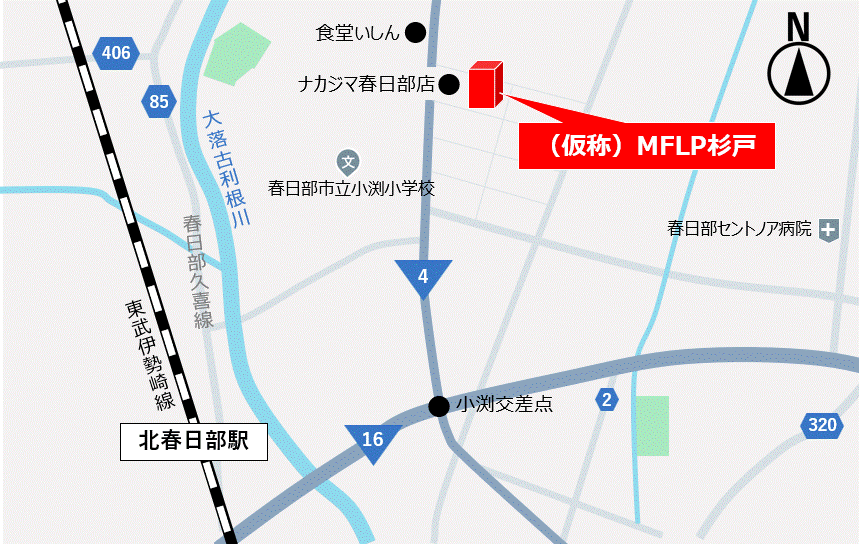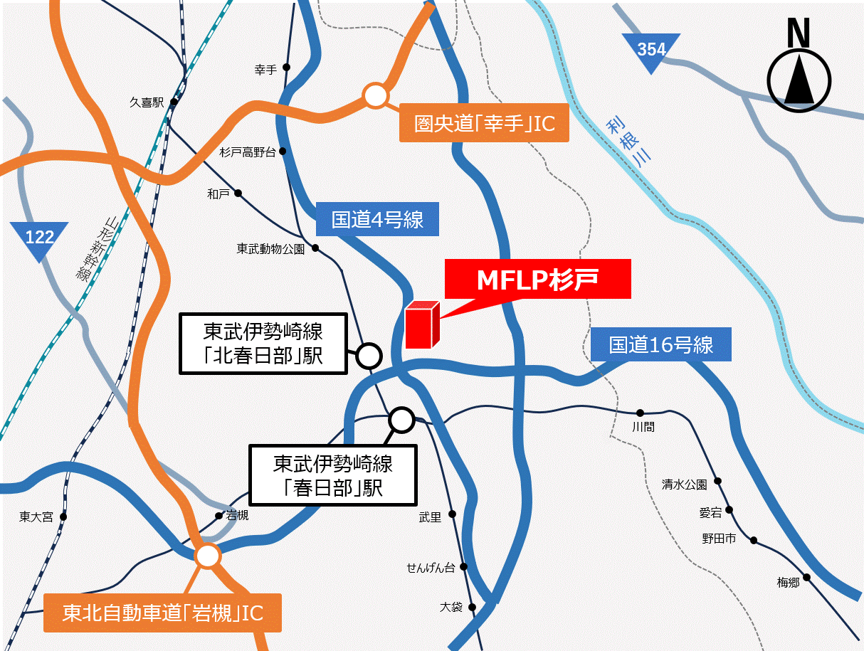 (仮称)MFLP杉戸は、国道4号線・国道16号線に近接しており、また圏央道「幸手IC」及び東北自動車道「岩槻IC」から約11kmの距離に位置しております。幹線道路の利便性や2つのインターチェンジを使用出来ることから、首都圏全域への広域配送に適している立地となっております。